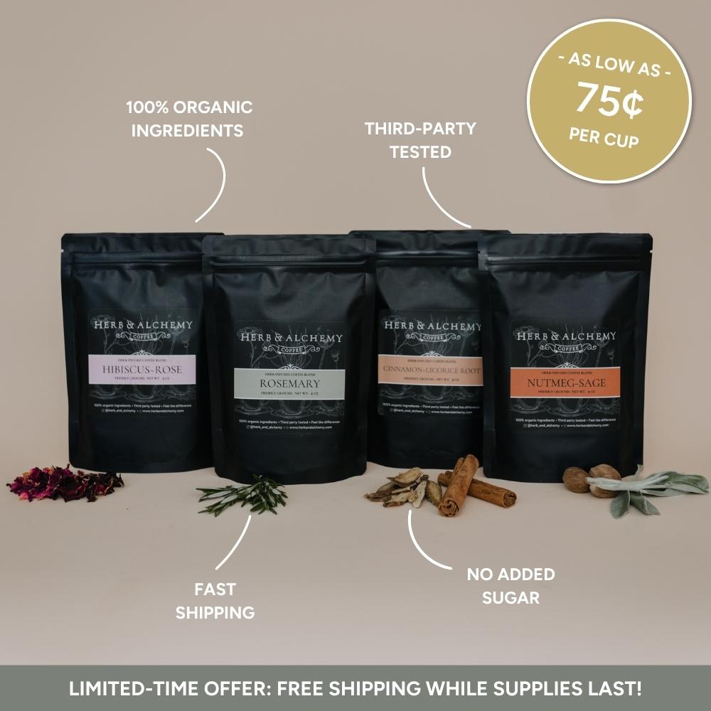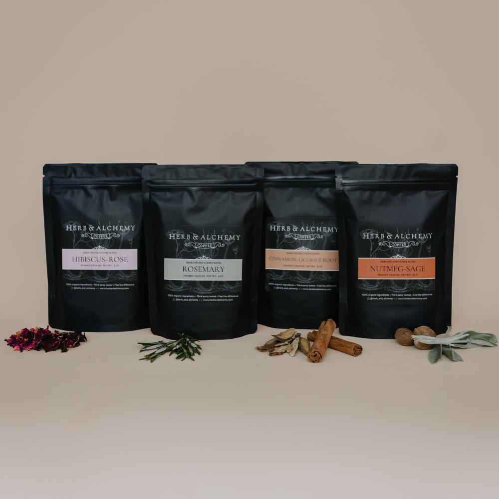 All of the coffees that Herb & Alchemy make are delicious, but my favorite is the hibiscus rose, it has a subtly sweet and tangy flavor to the coffee. My favorite way of preparing it is with a little bit of honey and coconut cream. So delicious and uplifting!